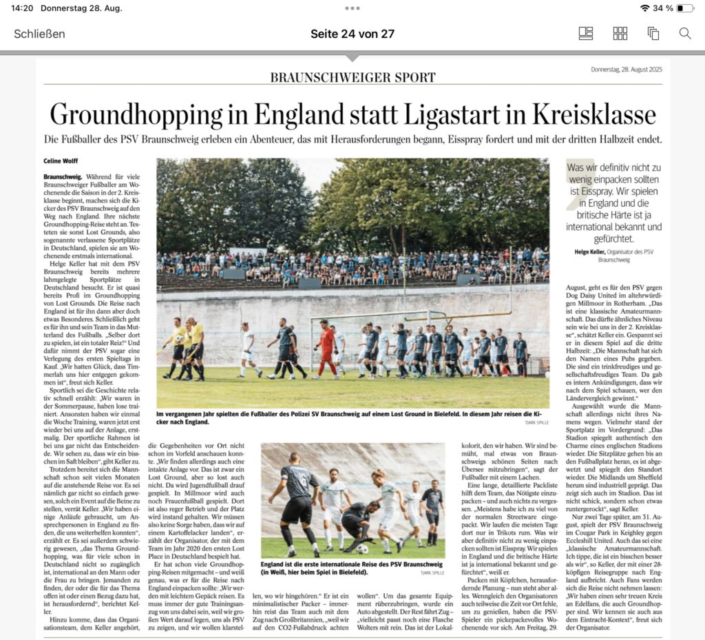 From Pitch to pub – PSV All England Tour oder PSV goes international. Natürlich wollen wir dabei sein. Zwei Spiele, zwei Grounds: Dog Daisy United FC vs. PSV Braunschweig – 29.08.2025 – 6:30 pm – Millmoore Ground / Eccleshill United FC Sven. PSV Braunschweig – 31.08.2025 – 12:00 am – Cougar Park