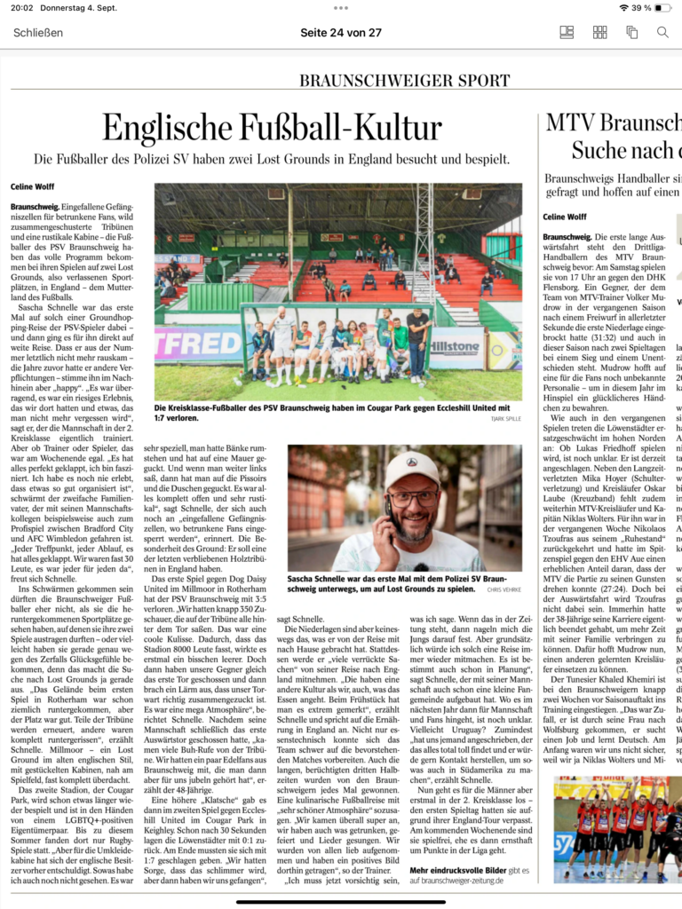 Die urige Arena, die mittlerweile stillgelegt ist, verkörpere genau das, was die Region ausmacht. Rotherham liegt in South Yorkshire – einer Gegend, die stark vom Kohlebergbau, der Stahl- und Schwerindustrie geprägt war. Das Stadion habe viele Ecken und Kanten und spiegele „im positivsten Sinne das Abgewetzte“ wider, das auf Groundhopper eine besondere Anziehungskraft ausübe. Und so wird der PSV in diesem Jahr noch einen draufsetzen: Ende August geht es für die Groundhopper erstmals ins Mutterland des Fußballs, wo sie zwei Freundschaftsspiele bestreiten. Am 29. August treffen sie in besagtem Millmoor-Stadium in Rotherham auf Dog Daisy United. Zwei Tage später, am 31. August, geht es im Cougar Park in Keighley gegen Eccleshill United. Auf seinen Social-Media-Kanälen hat der PSV Braunschweig schon den Start des Ticketverkaufs angekündigt.