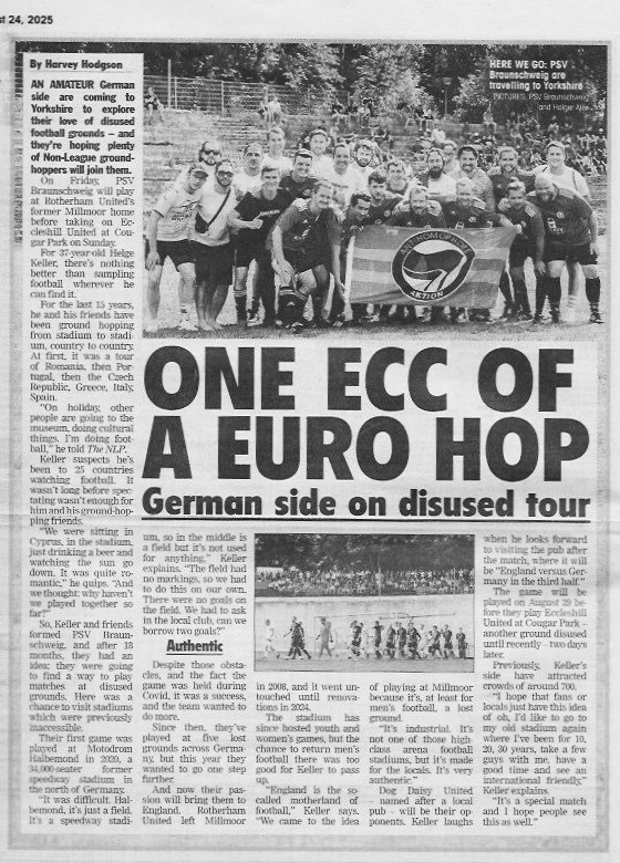 A TEAM of ground-hopping enthusiasts from Germany will be heading to Cougar Park tomorrow for a one-off friendly fixture with Eccleshill United. PSV Braunschweig, who combine playing in Germany’s tenth tier with tours to unusual football venue s, will play their second of two friendly fixtures as part of a UK tour.On Friday night PSV travelled to Millmoor, the former home of Rotherham United, to face off with ‚Dog Daisy United‘, and now they will head to West Yorkshire and Cougar Park to take on Eccleshill United.
