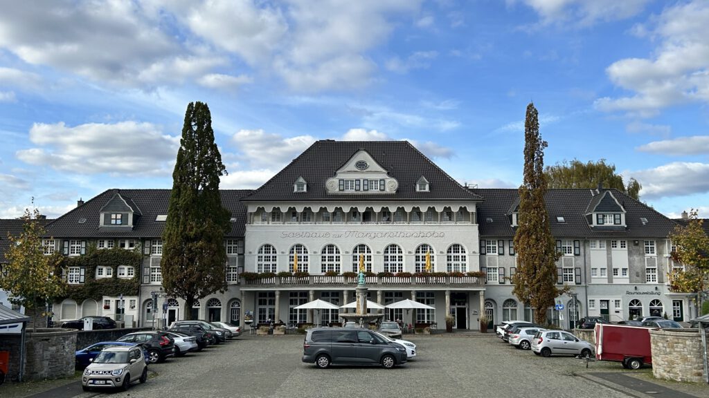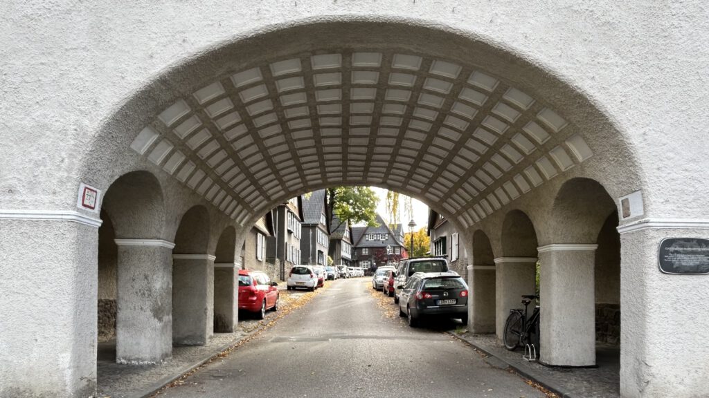 Weiter geht’s zur Margarethenhöhe, benannt nach der Stifterin Margarethe Krupp. Eine Vorzeige-Gartenstadt, entstanden zwischen 1909 und 1938. Die Idee ist ein schön gelegenes, trautes Heim, mit Garten und mitten in der Großstadt im Herzen des Ruhrgebietes. All das gelingt: es entsteht eine Siedlung mit attraktiven Wohnungsbedingungen, nicht nur, aber vor allem für Angestellte und Mitarbeiter des Krupp-Konzerns.