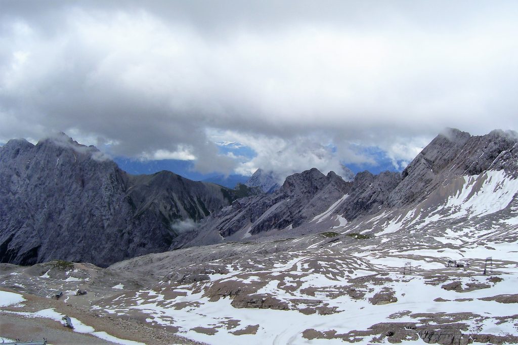 Passend zur Fahrt zum Zugspitzmassiv begleitet mich Wagners gewaltige Musik. Man kommt, wie ich finde, angesichts dieses gewaltig-harmonischen Gebirgszuges unweigerlich auf den Gedanken, dass die Inspiration für Wagners Musik neben der Mythenwelt mindestens auch von solchen Naturgewalten kommen muss. In beidem finde ich gleichermaßen eine komplett offenbare, umfassende, vereinnahmende Gewalt und oft fast gleichzeitig eine zurückgenommene, gleichsam nur angedeutete sanfte Spielerei, quasi jederzeit bereit, einen sofort und ohne Vorwarnung zu überwältigen. Ganz banal steckt dann die Zugspitze inmitten einer Wolkendecke, was natürlich schade ist, aber Wetter hat eben seine eigene Choreographie. Zum Glück gibt es aber 300 m tiefer eine weitere Station mit Blick auf Gletscher und grandiosem Rundumblick. Habe ich noch schwer geschluckt bei 47 € für hoch und runter, sehe ich das nunmehr als leidlich annehmbare Investition für immerhin 2000 zu überwindende Höhenmeter und immerhin den höchsten Berg Deutschlands, schließlich will ich mich ja entspannen und mich nicht dauernd über diesen Preis aufregen, obwohl dieser mehr als dreist ist.
