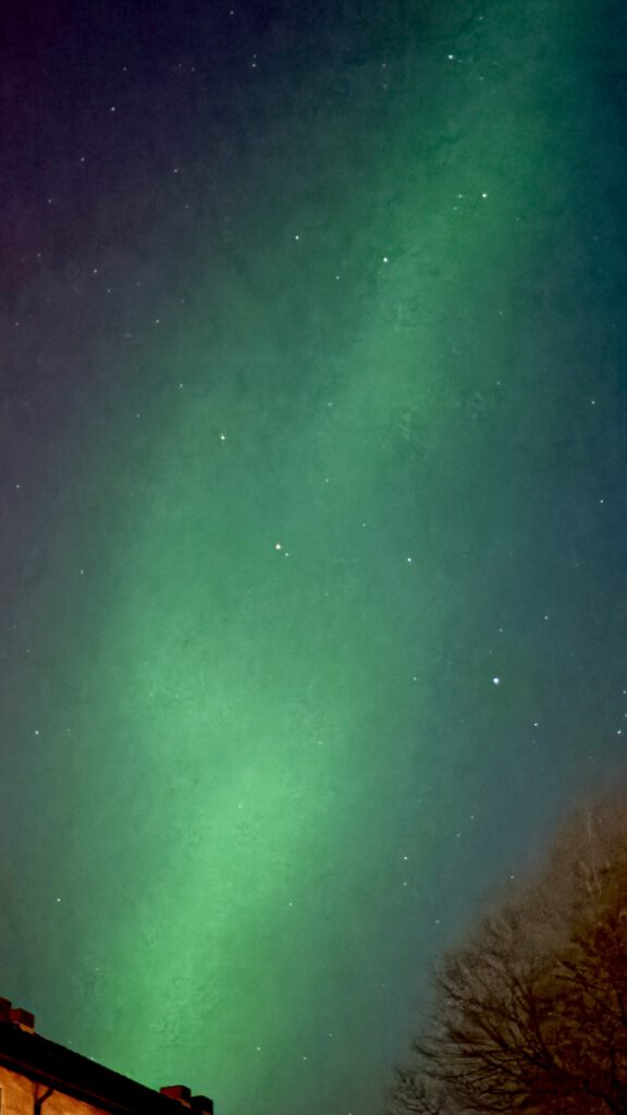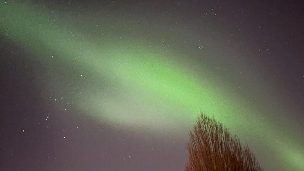 Und um ehrlich zu sein: wir haben die Polarlichter seinerzeit zwar gesehen – irgendwie zumindest. Also blass waren sie schon. Und die Bilder, die ich damals gemacht habe, sind der iPhone-Kamera zu verdanken, die holt mit ihrer Technik mehr raus als das menschliche Auge. Klingt verrückt, ist aber so. Unabhängig davon war das Ereignis magisch.