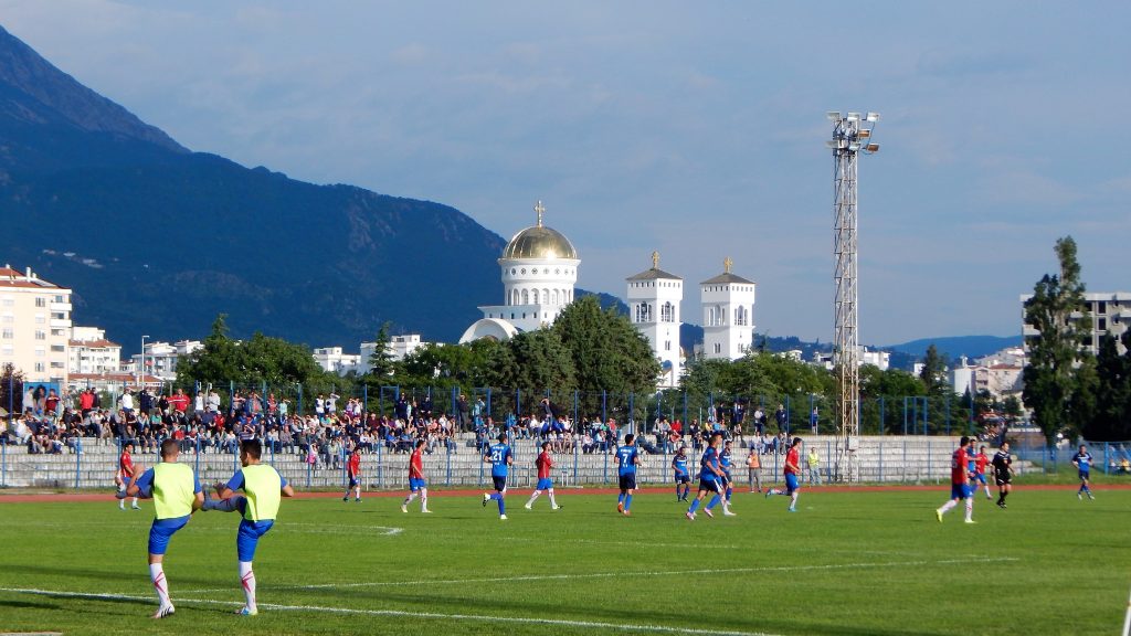 Nächste Erfahrung dann kurz nach der Grenze. Polizei. Anhalten. Irritation. Aber die meinen gar nicht mich persönlich. Alle Autos, selbst Fahrradfahrer müssen von der Bahn. Dann irgendwann Blaulicht, paar schwarze Limousinen, nochmal Blaulicht. Und dann ist auch schon alles wieder vorbei. Irgendein Regierungsmokel sicherlich. Das hat mir natürlich ordentlich Zeit von der Uhr genommen, die City von Stari Bar muss ausfallen, es geht direkt zum Stadion. Das kann mit traumhafter Lage punkten. FK Mornar auch, sie drehen sogar ein 0:1 in ein 3:1, absteigen müssen sie dennoch. Tickets gibt’s hier nicht, das Stadion ist von allen Seiten leicht zugänglich und die Zäune sind kein Sichthindernis, da hat man sich das gespart. Die Tribüne hat man dann auch gleich außerhalb des Zauns errichtet. Mein Ticket habe ich ja quasi schon an der Grenze gelöst, es wurde ne überflüssige und bescheuerte Auslands-Versicherung fällig.