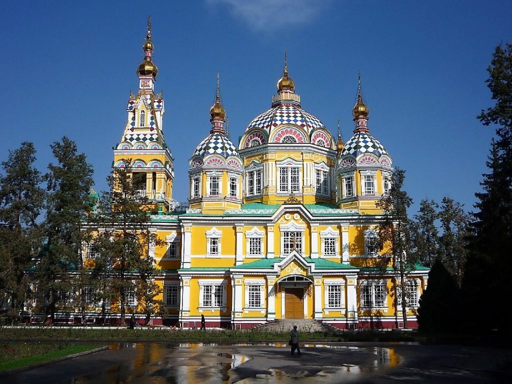Um zwei können wir endlich einchecken und die Gelegenheit nutzen, zwei Stunden in der Waagerechten zu verbringen. Bitter nötig. Danach suchen Henning und ich frische Luft im gegenüberliegenden Park der 28 Panfilov-Gardesoldaten (benannt nach dem Garderegiment von Iwan Panfilov. Bei einer Schlacht bei Moskau vernichteten sie 50 deutsche Panzer, verloren aber auch 28 der Soldaten) mit seiner Heiligen Himmelfahrtskathedrale. Es ist der 10.10. und es werden quasi im Minutentakt Hochzeiten im russisch-orthodoxen Stil zelebriert. Weiter geht es die schnurgeraden und rechtwinklig ausgerichteten Prospekte entlang. Positiv ist, dass Almaty unglaublich viele Bäume hat und damit sehr grün ist. Weniger positiv sind diese breiten Prospekte und Straßen, die uns in Verbindung mit den Wohnblocks erstens wenig Abwechslung bescheren und zweitens auf die Ära des sozialistischen Realismus verweisen. Dieses Bild ändert sich auch nicht, als wir später mit der Family auf der Suche nach einer Lokalität erst fünf Querstraßen geradeaus, dann sechs Querstraßen nach rechts und dann noch ein Stück gehen. So kann man sich hier in Almaty leicht orientieren, gerade wenn die Straßennamen mal wieder fehlen oder nicht zu lesen sind. Es folgt Essen, ein paar Bier, ein paar Wodka, landestypisch eben. So kommen wir in meinen Geburtstag.