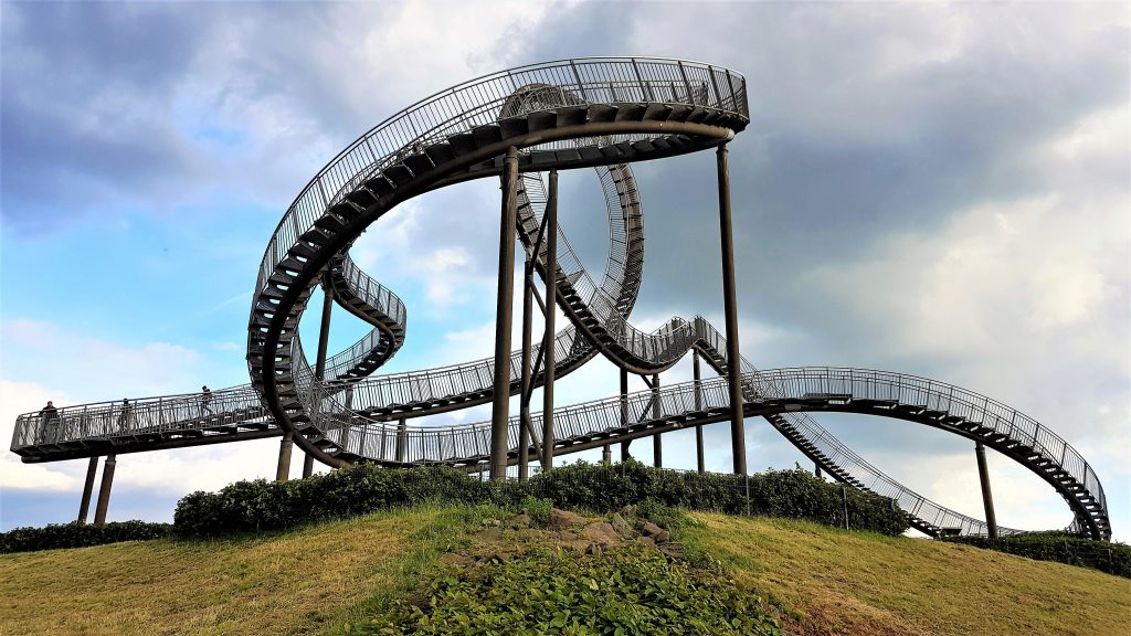 Das Wetter ist gut, es ist Sommer und so geht es anschließend noch zur Heinrich-Hildebrand-Höhe, auf der seit 2011 mit Tiger and Turtle eine achterbahnähnliche Skulptur steht. Abgefahrenes Ding, 2015 im Dezember war ich mit Patrick da, heute dann wieder. Und der Reiz ist nach wie vor vorhanden. Zum einen läuft man hier ja schon auf vergangenem Bergbau herum, einer Industrie, die struktur- und taktgebend für das Revier war und irgendwie immer noch ist. Obwohl dieses Jahr endgültig Schluss ist. Zum anderen dehnen sich gerade am Fuße des Hügels die Krupp-Mannesmann Hüttenwerke aus. Industrie des Reviers, befeuert von der Kohle des Reviers.