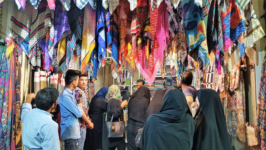 Panzdah Khordad ist die U-Bahn-Station um die Ecke vom Basar, der ein Muss ist in Teheran. Kaum aus der Station raus steht man quasi schon mittendrin. Auf der Straße absolutes Chaos. Alle mit allem gleichzeitig – ich liebe es. Unzählige Taxis, unzählige Mopeds, unzählige Menschen, unzählige Autos, Busse, Kleintransporter. Der Basar muss beliefert werden, die Leute wollen hin und wieder weg – und irgendwie findet alles gleichzeitig statt. Nichts für schwache Nerven, aber absolut faszinierend. Ich genieße es und werde zum Schluss sogar noch mit einem schicken Ausblick auf Teheran, den Verkehr und die Berge belohnt.